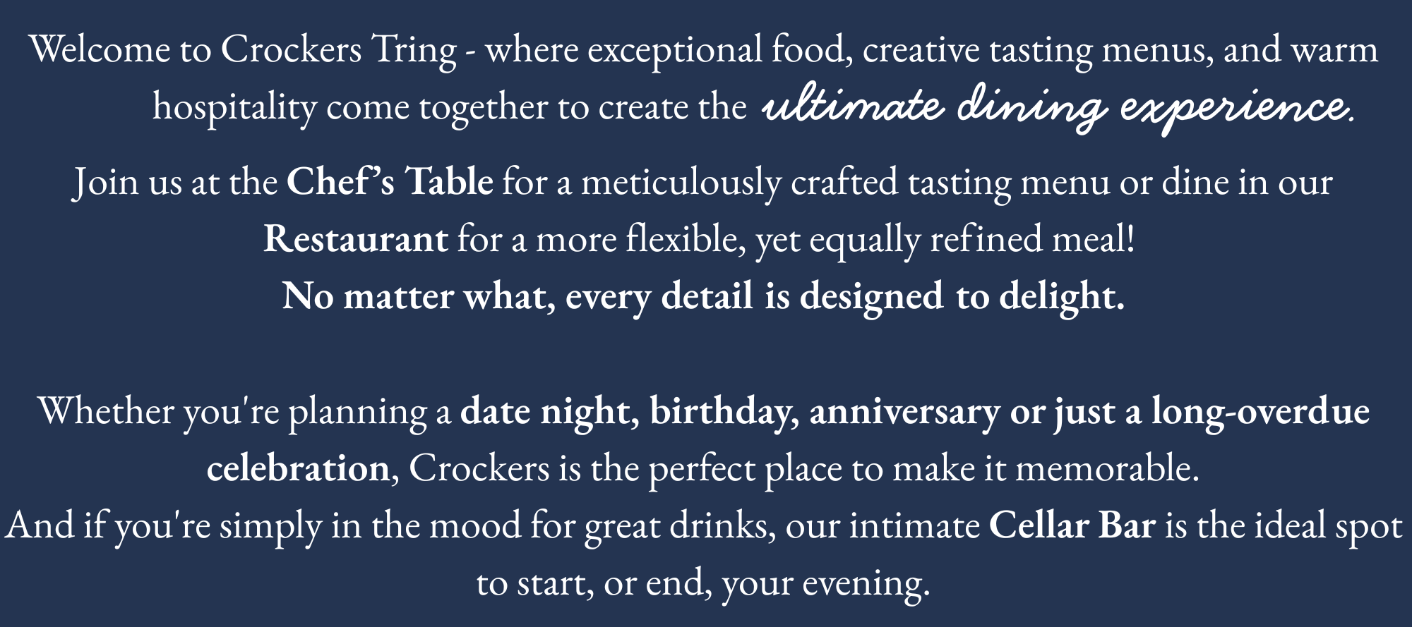 Scott then progressed his work in some prestigious kitchens. After spending nine years at the award winning Colettes at The Grove in Watford, he took a huge leap and joined Crockers. Scott and his team now continue to wow guests with a great dining experience at Crockers Tring.